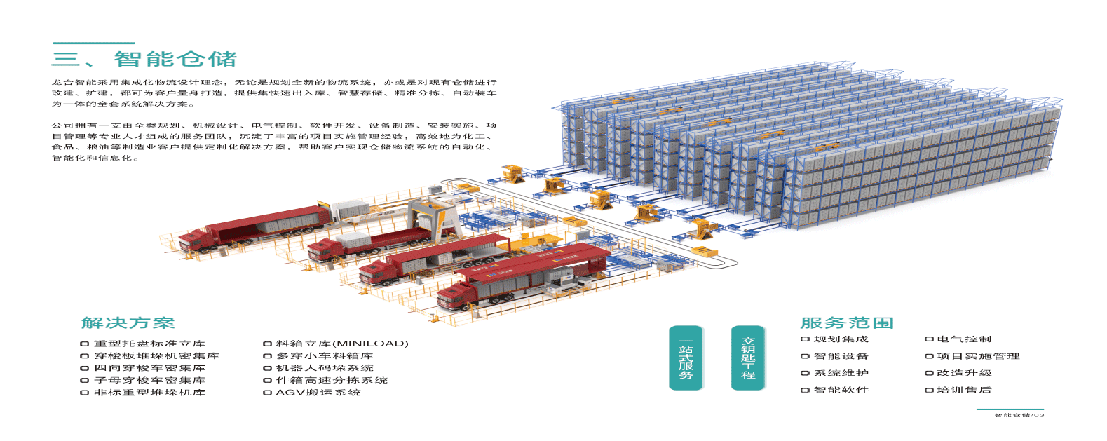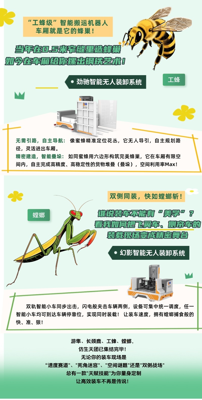 幻影/靈空/極速/勁馳四大產(chǎn)品線(xiàn):全面覆蓋國(guó)內(nèi)公路運(yùn)輸所有車(chē)型,包括后裝式集裝箱車(chē)、飛翼式集裝箱車(chē)、卷簾車(chē)、邊欄板可拆放及不可拆放平板車(chē)等終端物料發(fā)貨裝車(chē),裝車(chē)過(guò)程實(shí)現(xiàn)自動(dòng)化、智能化操作,20分鐘內(nèi)完成30噸貨物裝車(chē),產(chǎn)品填補(bǔ)國(guó)內(nèi)終端物料智能無(wú)人裝車(chē)空白,可完全替代國(guó)外進(jìn)口產(chǎn)品,獲評(píng)省內(nèi)首臺(tái)(套)重大技術(shù)裝備4項(xiàng)、省級(jí)重點(diǎn)新產(chǎn)品9項(xiàng)。